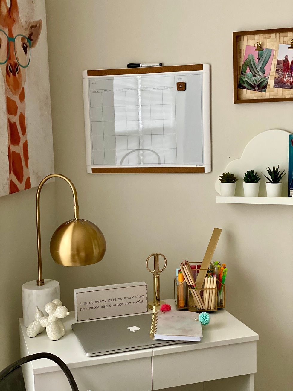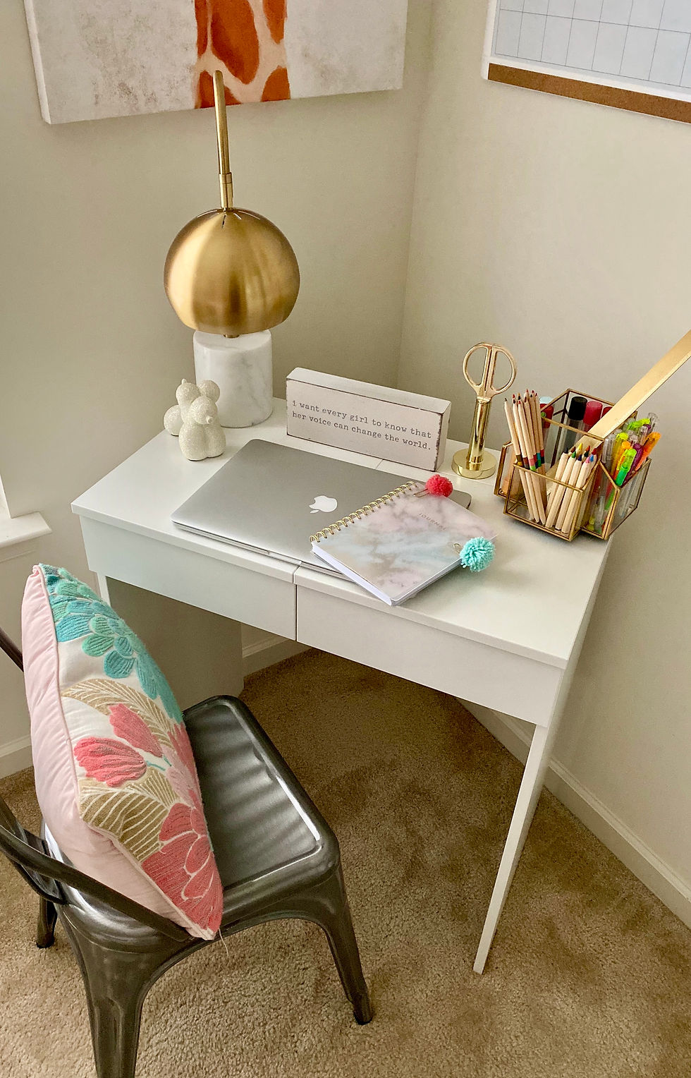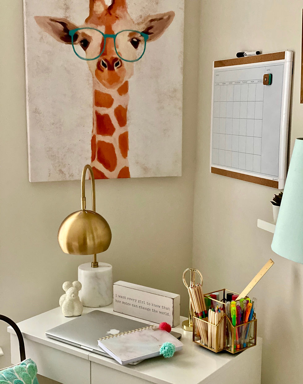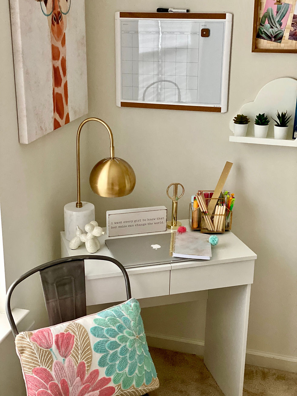 I decided to design a virtual learning space in Parker’s room to allow her more freedom and privacy. One that was cute, comfortable and inspiring. I wanted Parker to have a place to learn that was an extension of the comfort she finds in her room. Parker has become quite the interior design buff and picked out a task lamp, chair, and cute pencils and pens. It was so hard finding a desk and chair for her space. Desks and office chairs have become high demand products since most of us are working from home. With some creativity I was able to use the Ikea Brimnes dressing table as a really cool desk, I purchased most of the other items from my local Home Goods and target. Overall, Parker is extremely excited about having her own space to learn and thinks I’m the coolest mom ever for now.